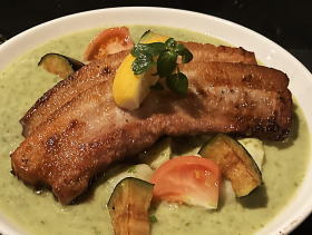 | カレイとフクラギ ワサビマスタードの丸ごとグリル 920円 青菜とスマッシュポテト添えです。 |