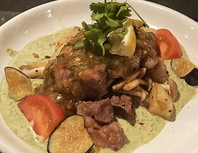 レモングラスの牛肉サイコロステーキ 980円 サイコロステーキ用にレモングラスソースをつくってみました。トッピングはナムチムのソースです。 |