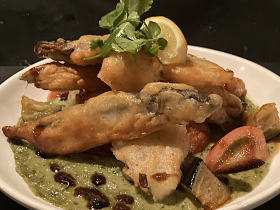 魚貝のフリッター 菜の花と白味噌のソース 950円 牡蠣、白身魚、烏賊等のフリッタートに白味噌の濃くのある青菜のソースです。ピングはナムチムのソースです |